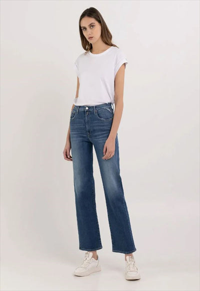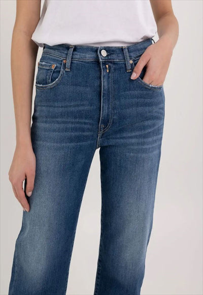 جينز مستقيم بخصر عالٍ وساق واسعة ومستقيمة. مع لمسة عتيقة، هذا الثوب مصنوع من القطن بوزن 10.5 أونصة والدنيم المودال مع لون أزرق متوسط لمظهر عتيق. يتميز عنصر الجيوب الخمسة بالشوارب والكسور مع وجود رجل موضعي على الساقين.