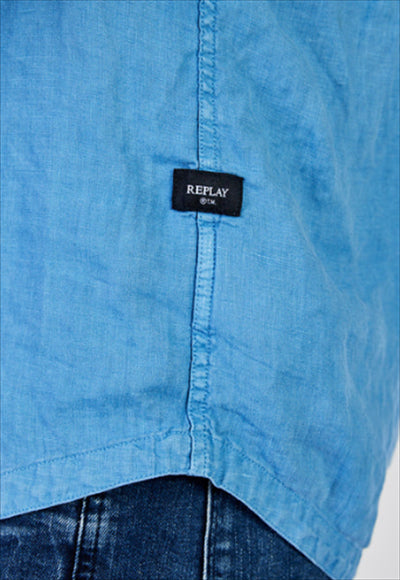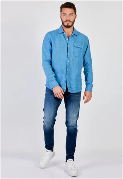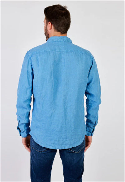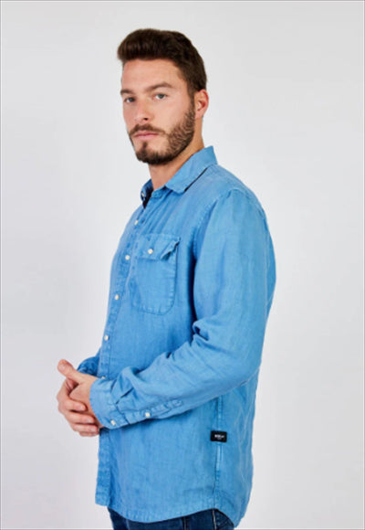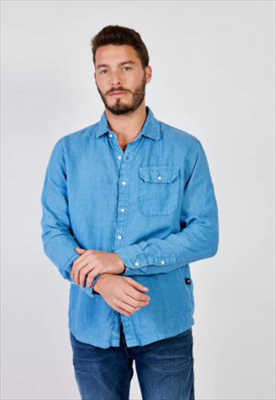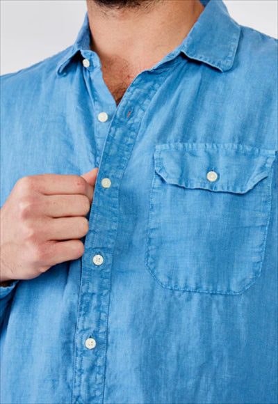 قميص بقصة عادية مصنوع من الكتان المصبوغ. تم تعزيز الثوب ذو الأكمام الطويلة مع جيب بغطاء على الصدر من خلال التثبيت بالأزرار.