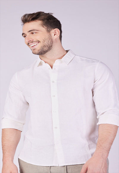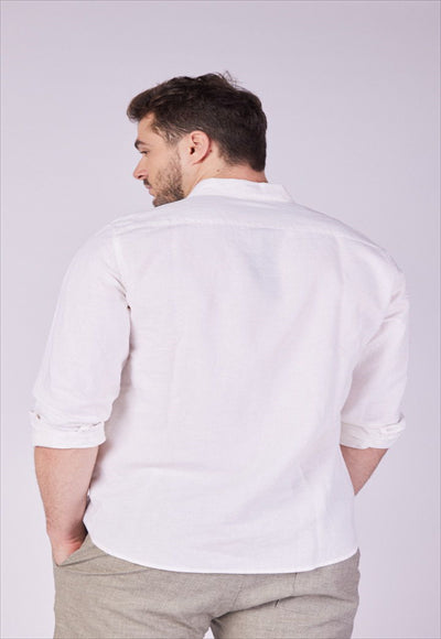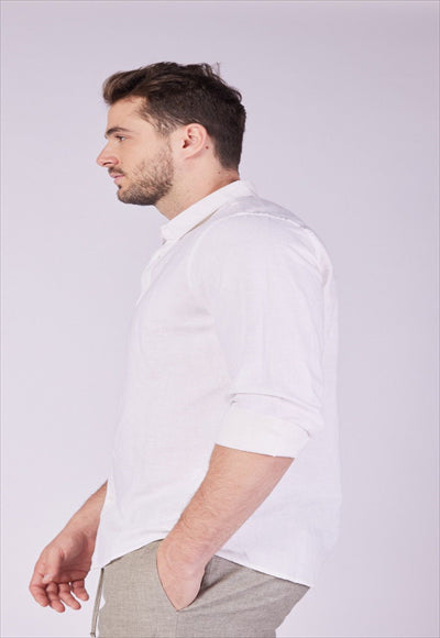 قميص رجالي بأزرار سفلية وياقة ساق وزر في الأمام. القميص ذو أكمام طويلة ومصنوع من قماش الكتان الإيطالي عالي الجودة.