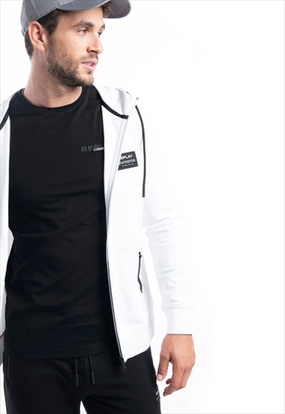 سويت شيرت بغطاء رأس وسحاب باللون الأبيض مع تفاصيل صغيرة باللون الأسود، مع أساور على الأطراف.