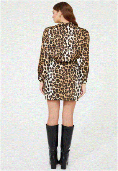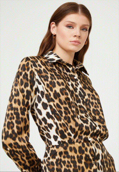Product Features shirt dress front buttons buttoned sleeves Fabric: 100% Polyester Sleeves: Long sleeve Collar type: Shirt collar Pattern: Cheetah skin print Story: An ordinary story