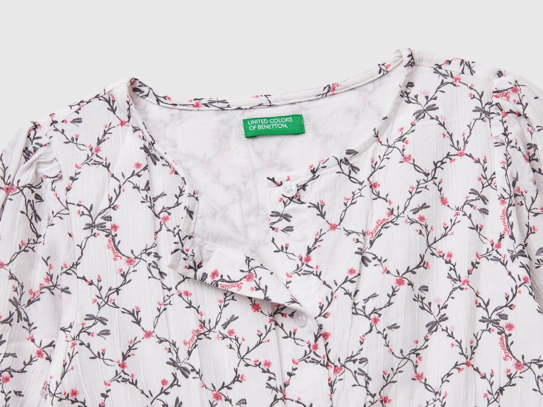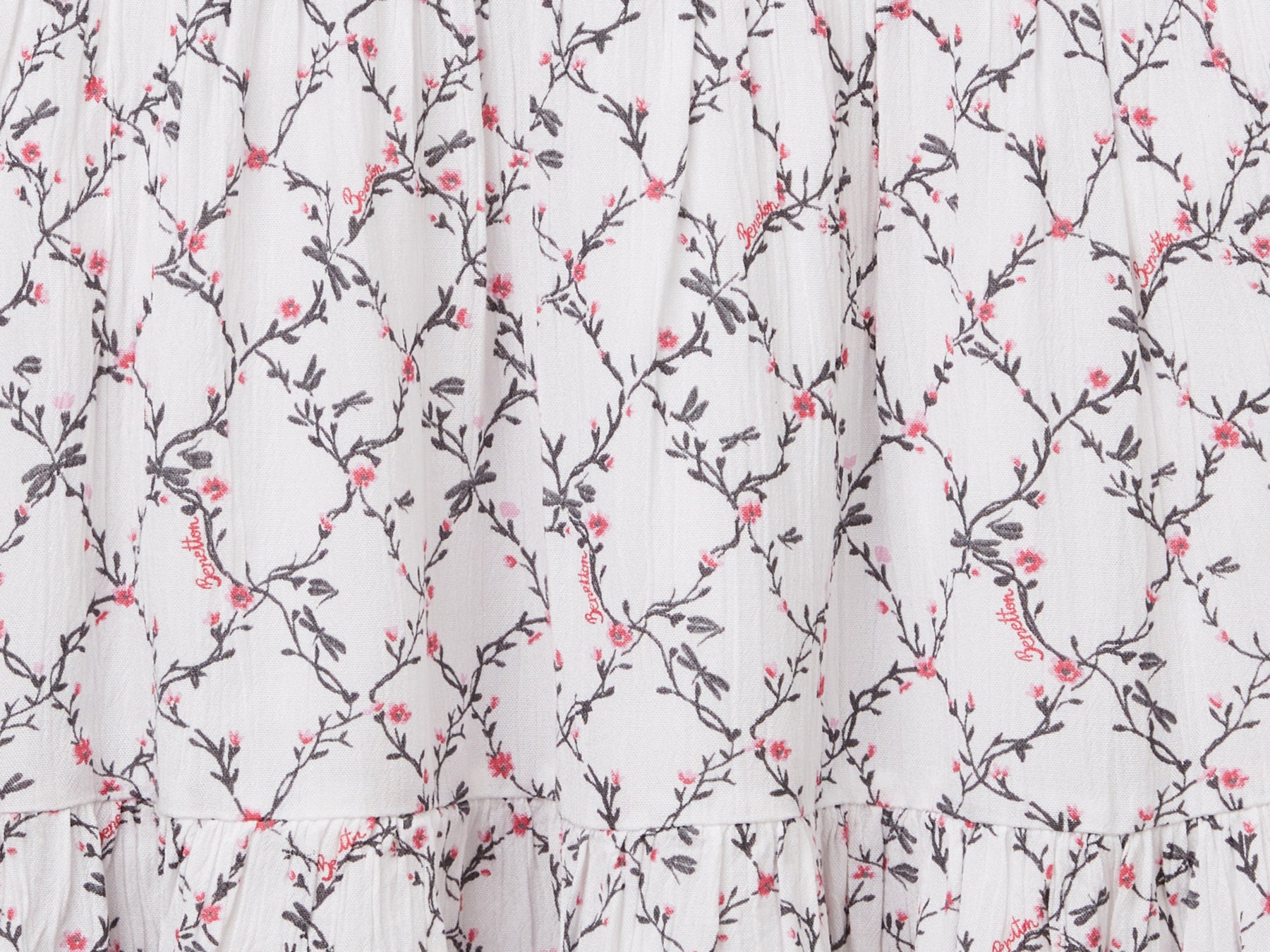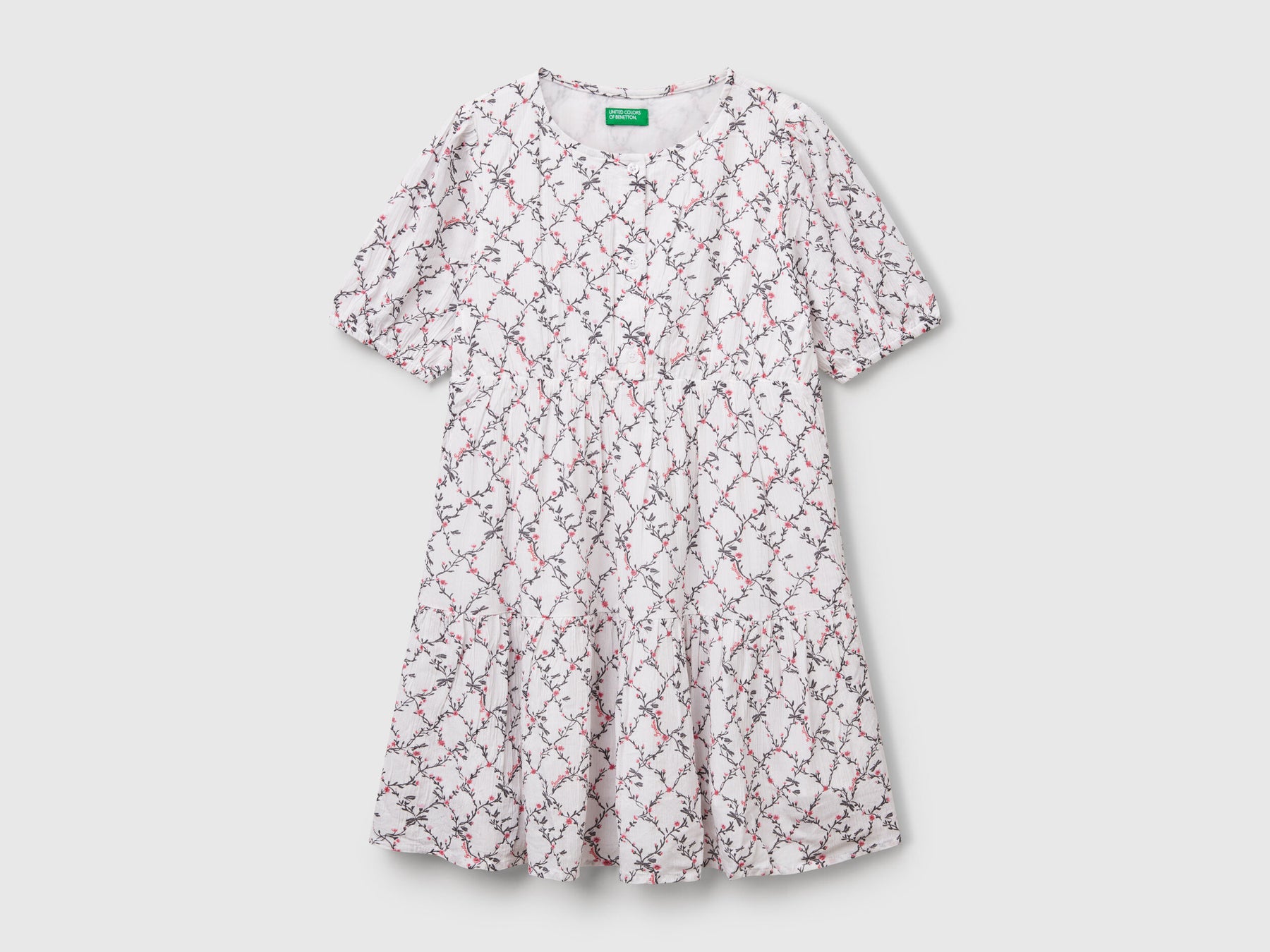 Short-sleeved dress made of pure viscose crepe fabric with a wavy design. Round neckline, partial front button opening, and ruffle on the skirt. Trendy and feminine, and can also be worn under a cardigan.