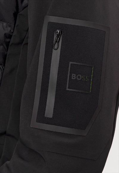 A water-repellent jacket combining a smooth structure and partial lining from BOSS Menswear, cut in a regular fit for easy layering. Suitable back length: 70 cm 82% polyamide 18% elastane Lining: 100% polyamide Filling: 80% duck feather 20% duck feathers Front panel: 100% polyamide