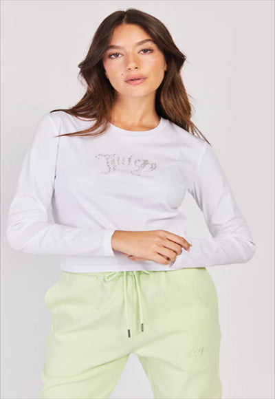 The product features body pieces, a round neckline, and a brand logo adorned with stones.