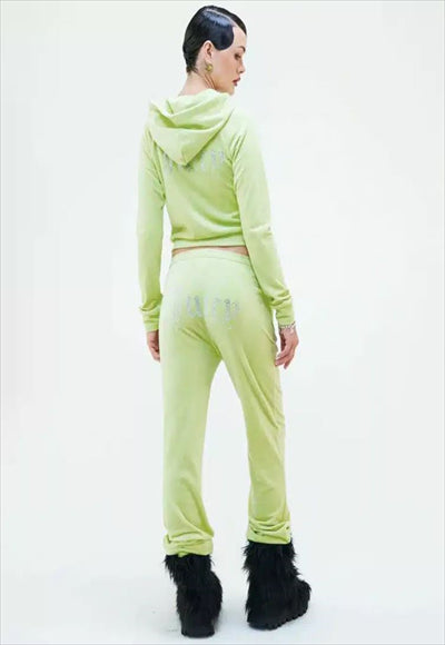 Classic plush butterfly diamond embellished hoodie. Slim zip-up style with hood, front pockets, and diamond crystal brand logo on the back. This jacket is finished with a silver gothic J-zip. Pair with matching bottoms for a statement tracksuit from Juicy Couture