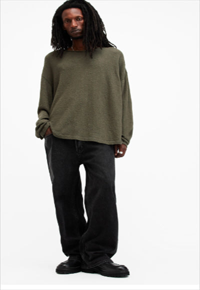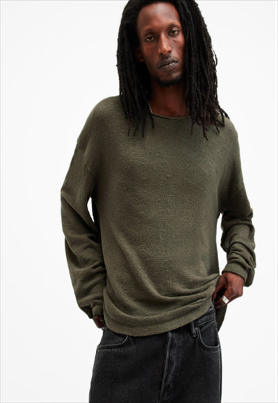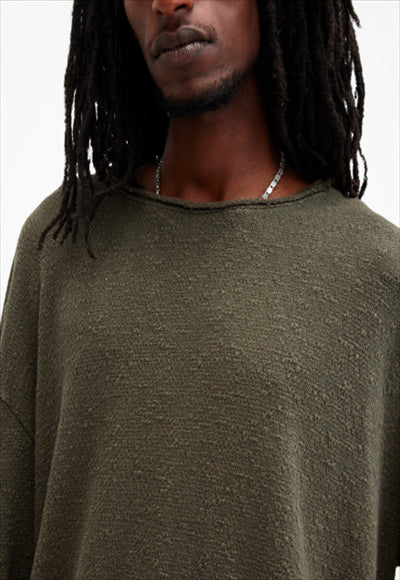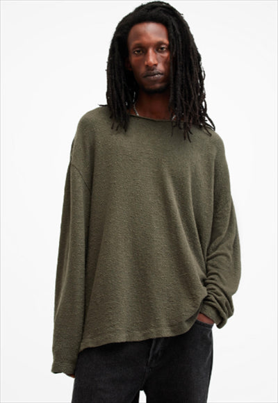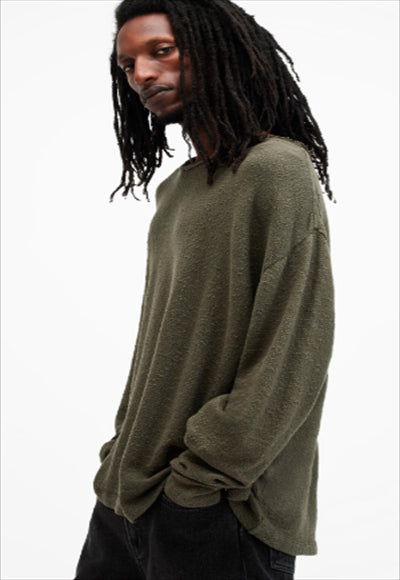 This shirt is designed to be worn oversized. If your size is between two sizes or you prefer the closer size, we recommend choosing the smaller size. pull over round neck long sleeves open slop fabric A neckline with a raw edge finish Single Needle Stitch Details Double-needle stitch details on the hem and cuffs