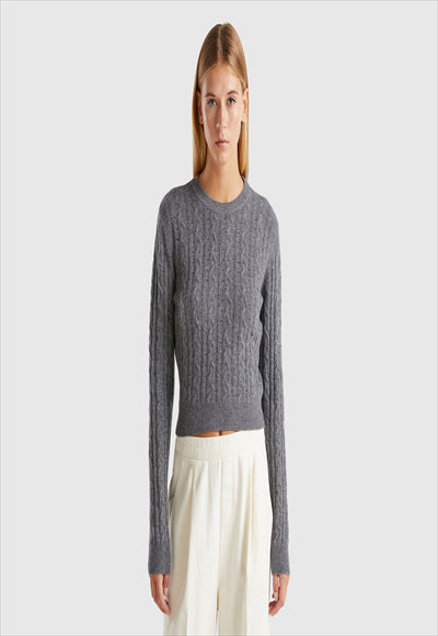 A long-sleeved sweater with a round neckline made from a soft wool blend. It has a short, fitted cut, with holes and ribbing throughout the piece. 80% wool, 20% nylon
