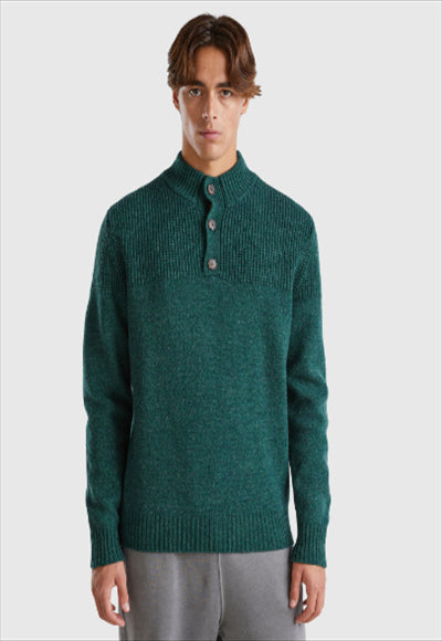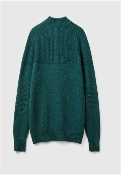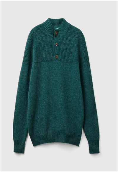A long-sleeved jacket with a high neck and a partial buttoned opening at the front. A combination of knitting: waffle stitch on the shoulder and yoke, and a straight leg on the rest of the piece. Made from 100% Italian Shetland wool yarn, abundant and surprisingly soft, featuring high durability. The presence of the Woolmark logo guarantees high-quality garments through the application and monitoring of specific standards in wool production, from breeding to the final product. 100% virgin wool