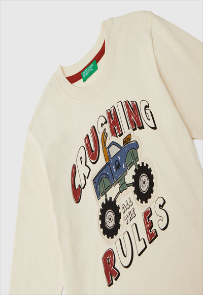Long-sleeved T-shirt with a round neck made of pure cotton with a warm texture. Printed on the front with fabric embroidery, for a pleasant and comfortable look.