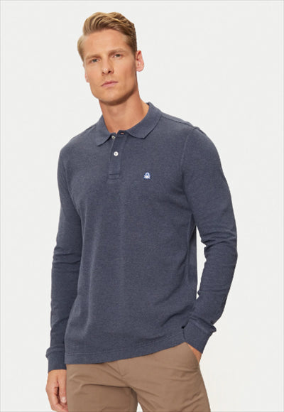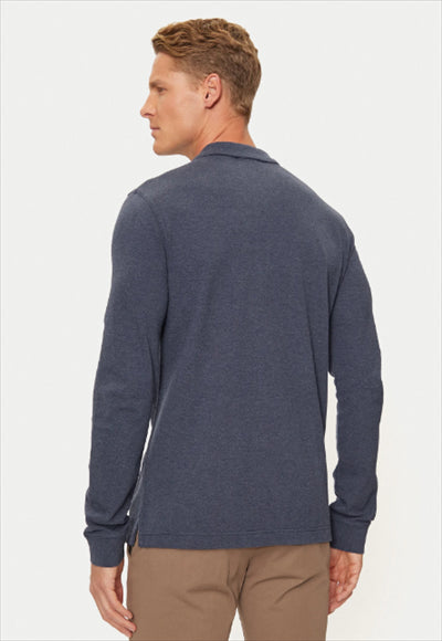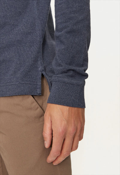 Long-sleeve polo shirt made from pure organic cotton with a mélange effect. Classic fit with a regular cut. Collar and partial button placket, side slits at the bottom, and a logo badge on the left chest. Casual and comfortable.