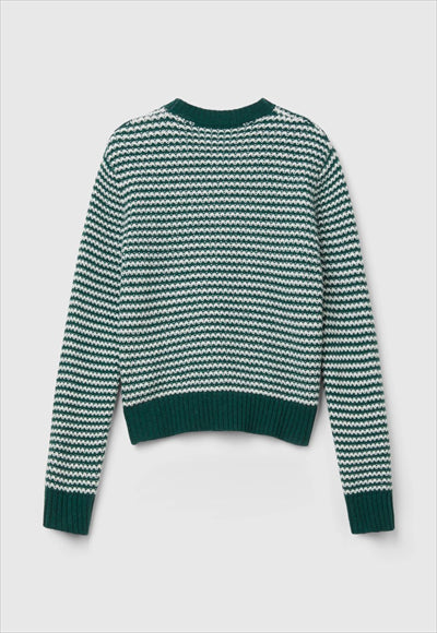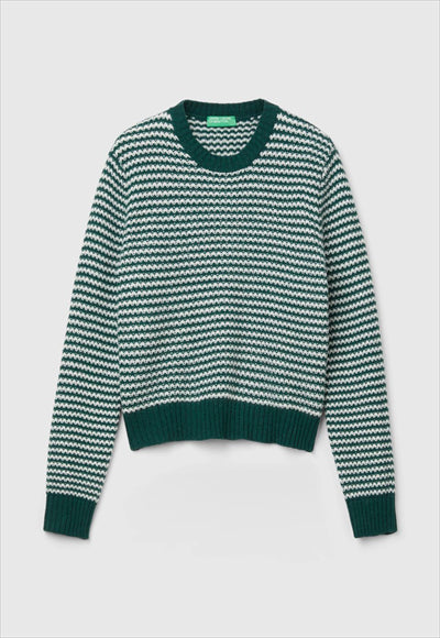 Long-sleeved sweater with a round neckline made from a soft wool blend. Short cut, knitted with striped stitches and patterns.