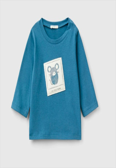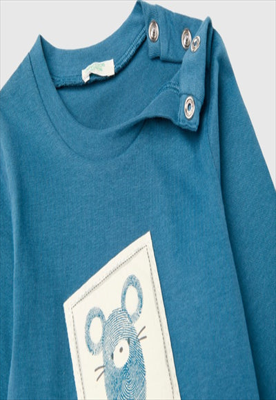 Long-sleeve T-shirt made of pure warm organic cotton. Round neckline, with a hidden snap button opening on the left shoulder. Animal print and logo on the front. Fun and easy to wear.