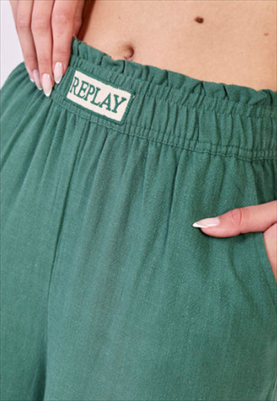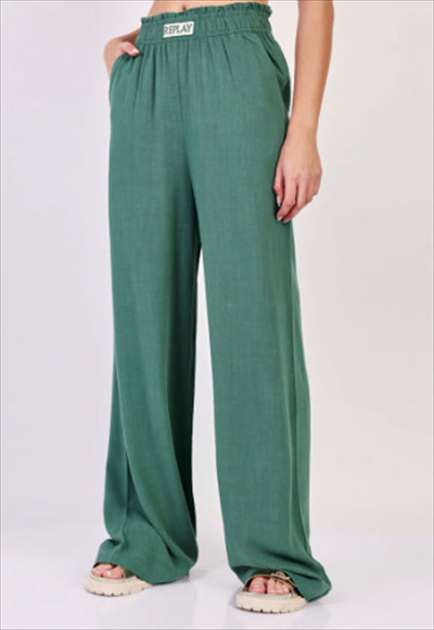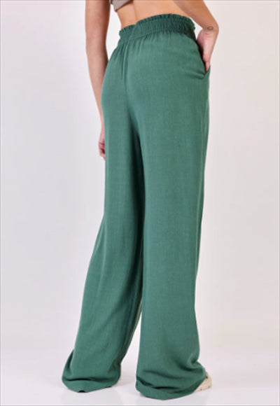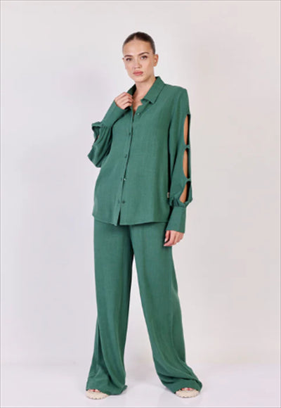Wide-leg long pants with an elastic waistband. The pants come with a matching button-down shirt.