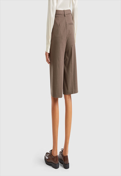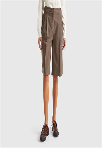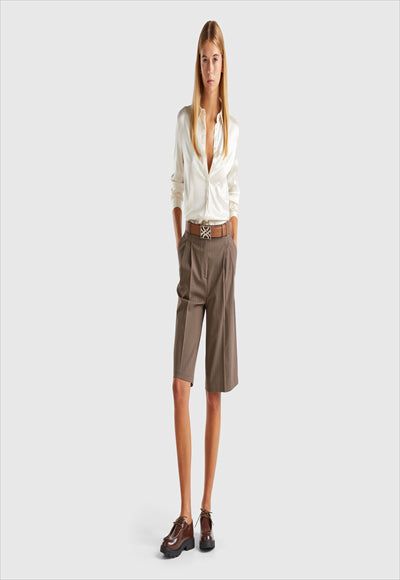 Shorts in a stretchy viscose flannel blend with subtle pinstripes. Zipper and button opening, center iron pleat. Front pleats. Front pockets and a side pocket at the back. Great for everyday use, perfect even in the office. 64% polyester, 34% viscose, 2% elastane