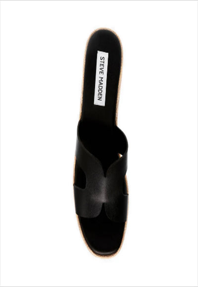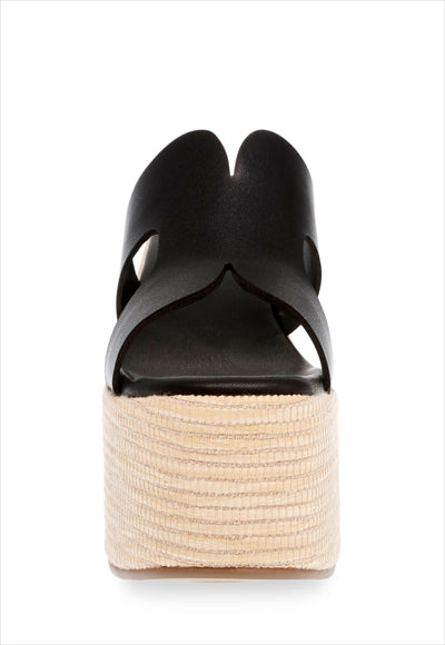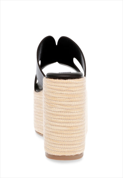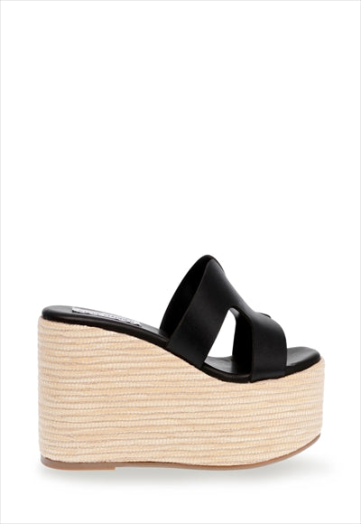 This is a summer sandal with a wedge heel, an open design, and an espadrille platform. • Material: Artificial leather • Wedge heel sandal with a square toe and an easy-to-wear platform • Platform height: 8 cm • Easy to wear design