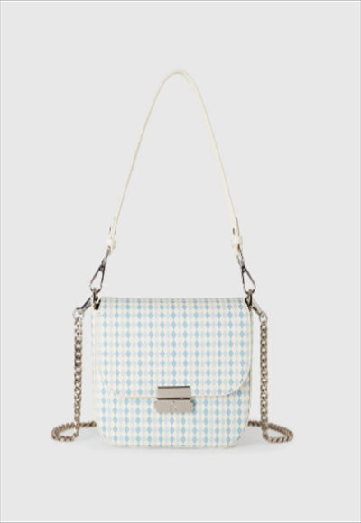 Small bag made of synthetic leather with an embossed diamond pattern. Front flap and metal clasp closure featuring the logo. Removable crossbody bag with a lightweight chain and shoulder strap, and a detachable handle for shoulder carrying. For elegant and modern looks.