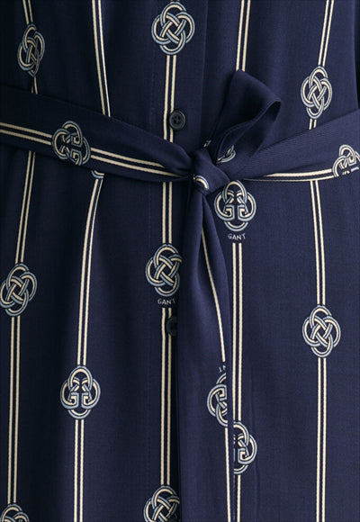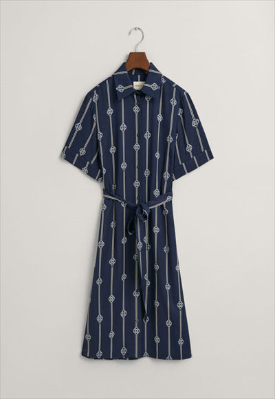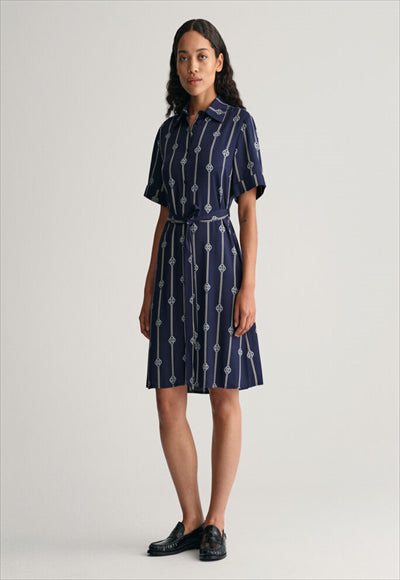 This short sleeve dress is the perfect basic piece for warm weather seasons. Made from luxurious viscose, the slim fit ends just above the knees and is detailed with an all-over monogram print pattern. Designed with a pointed collar, the dress also features dart details at the chest and back, a straight hem, recycled polyester buttons, and box pleats with a loop closure at the back. Material: 100% Viscose