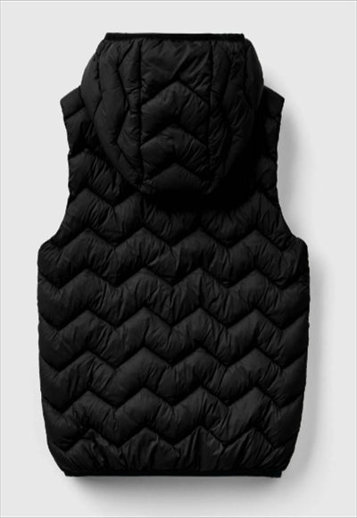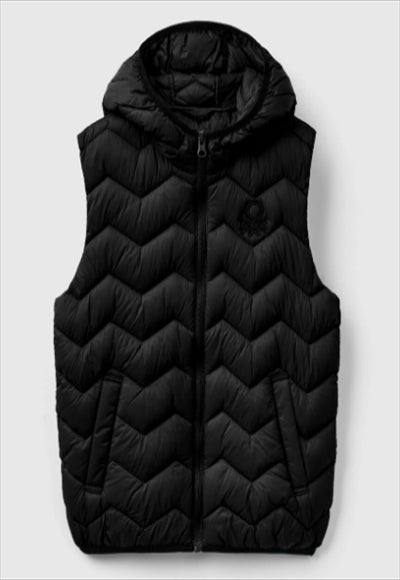 "Rain Defender" sleeveless nylon vest with Lycra inserts. Equipped with a practical hood, zipper closure and secure zipper guard. Front pockets and logo on left chest. Warm yet ultra-light, with a "Duck Free" filling of 3D fill that always returns to its shape. An "easy care" piece that can be machine washed and dried, following the instructions on the label.