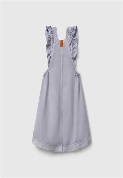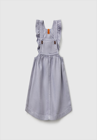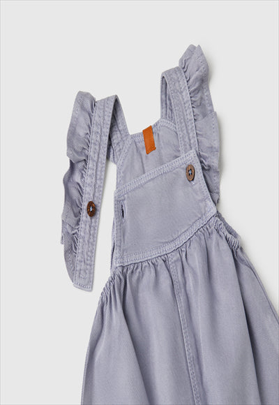 فستان دانغري أنيق وخفيف الوزن من الليوسيل الخالص. حمالات ثابتة بأزرار، وأكمام قصيرة مكشكشة، ومطاطية. أنيق وأنثوي، يناسب تيشيرت أو سترة قطنية.