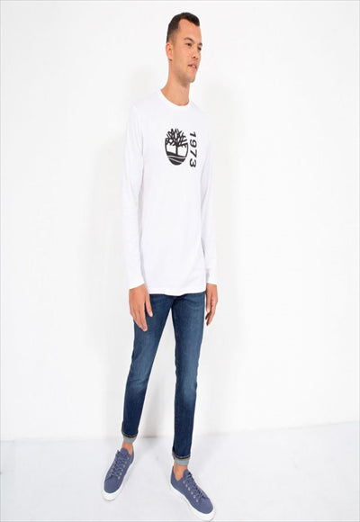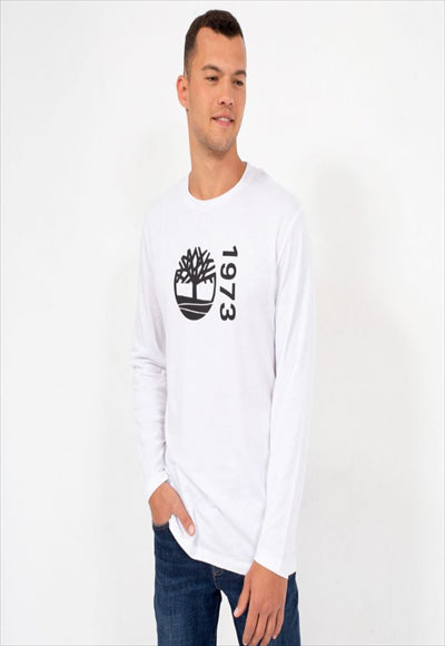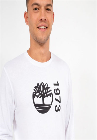 تيشيرت بأكمام طويلة ومكتوب عليه 1973 بجانب شعار تمبرلاند. تكوين القماش: 50% قطن عضوي، 50% ليوسيل.