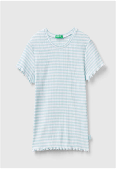 تيشيرت بياقة دائرية مضلعة من القطن المطاطي مع خطوط مصبوغة. مقاس عادي مع صدفية ناعمة في الجزء السفلي من الكم وأسفل الملابس. لمسة أنثوية لمظهرها اليومي.