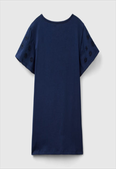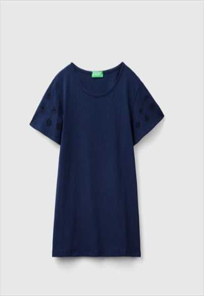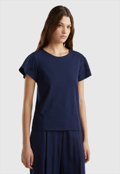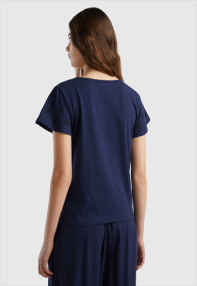 تيشيرت مصنوع من القطن المطاطي بياقة دائرية وأكمام قصيرة مع تطريز زهور بألوان متناغمة. مثالي لإضفاء لمسة رومانسية وأنثوية على الملابس اليومية.