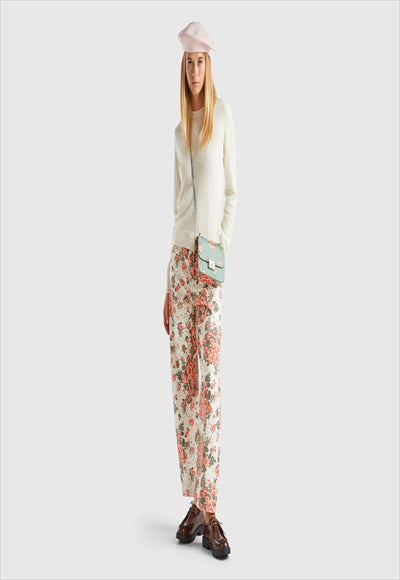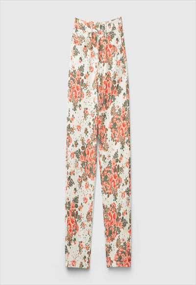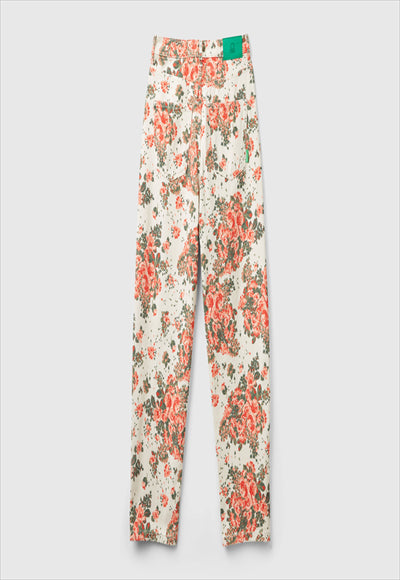 بنطلون طويل من قماش الدنيم القطني الخالص مع طبعة زهور في كل مكان. تصميم بخمسة جيوب مع فتحة بسحاب وأزرار. لإطلالة رومانسية وعصرية.