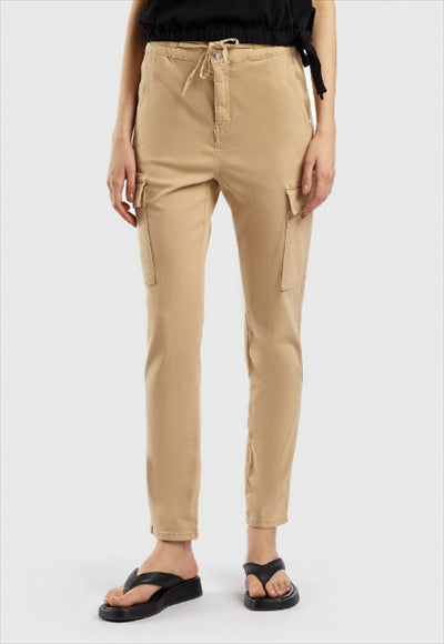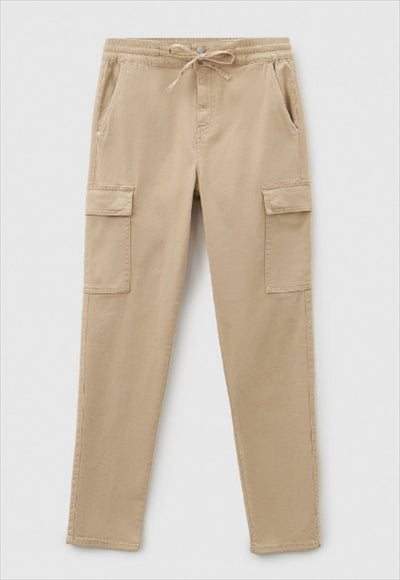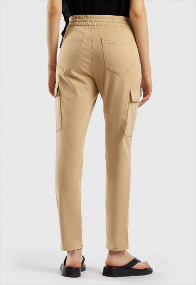 بنطلون نسائي من بينيتون بتصميم كارجو مصنوع من القطن المرن، موديل Slim Fit. خصر مطاطي في الخلف والجوانب برباط. فتحة بسحاب وأزرار، وجيوب كبيرة بغطاء على الساقين. 98% قطن 2% إيلاستين