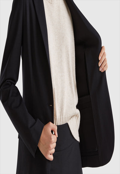 سترة بليزر من مزيج الفيسكوز المطاطي. قصة ضيقة، ياقة مع طية صدر كلاسيكية. إغلاق مريح بأزرار وجيب بغطاء في الأمام. مريحة ورسمية إلى المستوى المناسب.