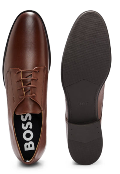 حذاء ديربي أنيق من BOSS، مصنوع من الجلد الناعم مع علامة تجارية منقوشة ونعل داخلي مبطن قابل للإزالة لتوفير أقصى درجات الراحة. نحن نبحث باستمرار عن طرق أكثر مسؤولية لإنتاج منتجاتنا وإنهائها. تم الحصول على ما لا يقل عن 60% من الجلود المستخدمة في صنع هذا المنتج من مدابغ معتمدة. الأربطة مكتمل الصف صندوق المحتويات