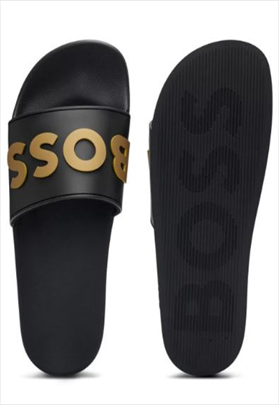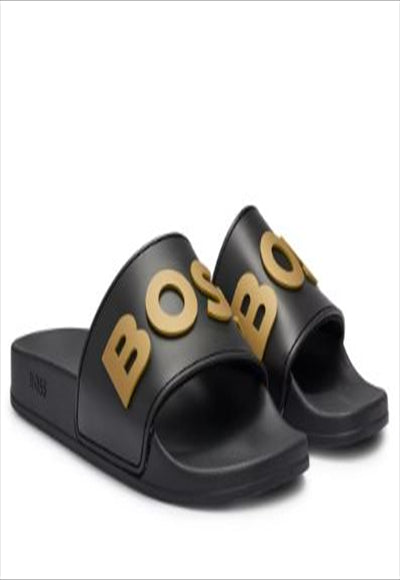 شبشب إيطالي الصنع من BOSS، مصنوع من مطاط خفيف الوزن مع شعار مرتفع على الحزام العلوي. إبزيم علوي: سهل الارتداء غير مُبطن صندوق المحتويات