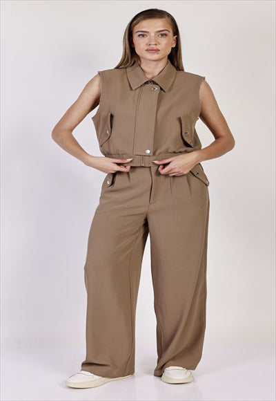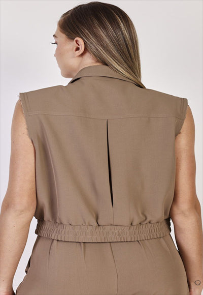 سترة نسائية قصيرة مع أحزمة كتف واسعة وإغلاق سريع في الأمام. جيوب جانبية بغطاء قلاب. نحيف