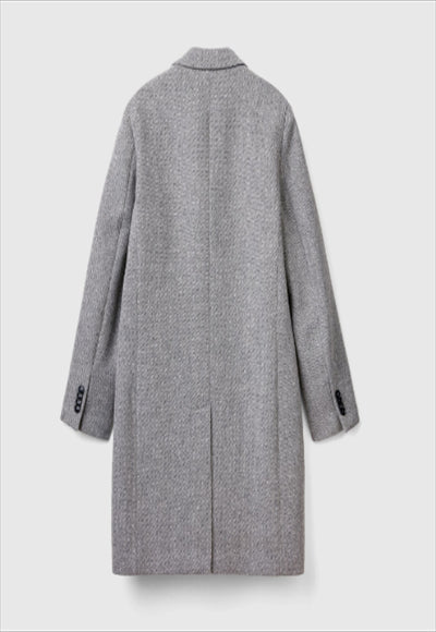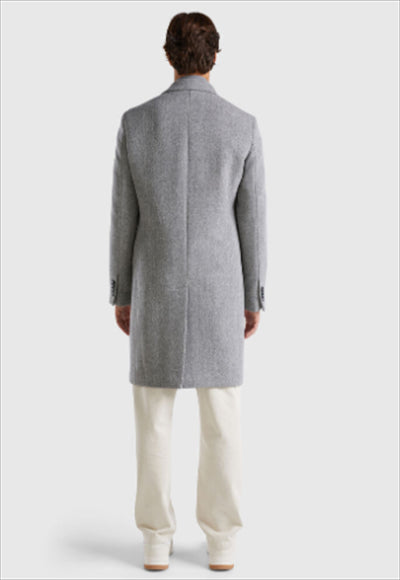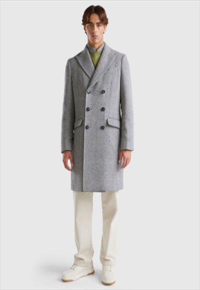 معطف طويل مزدوج الصدر من قماش مزيج الصوف الناعم. مقاس عادي، ياقة مدببة، جيوب جانبية بغطاء في الأمام وجيب على الصدر.