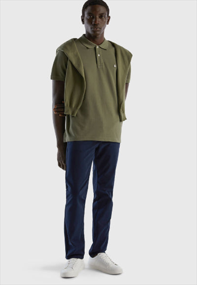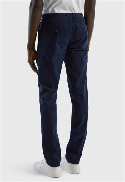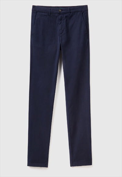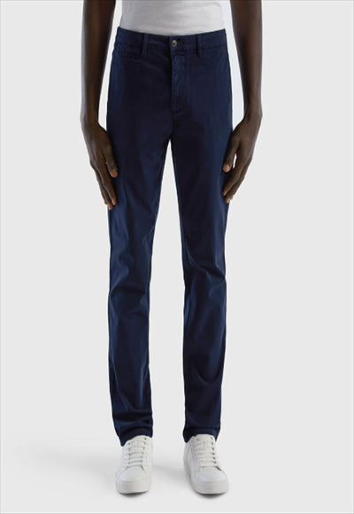 بنطلون تشينو طويل من القطن المطاطي بقصة ضيقة ، مناسب لكل من المكتب ووقت الفراغ. جيوب أمامية وخلفية، جيب إضافي في الأمام، طيات في الخلف وعرى حزام على الخصر لإطلالة كاجوال.